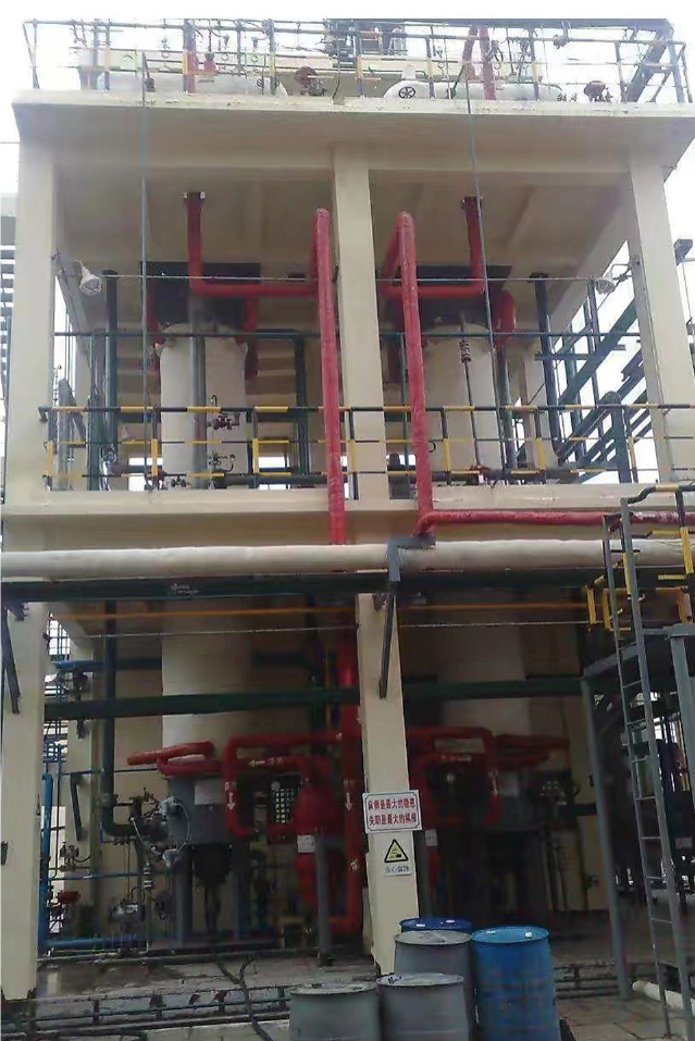 氯氣與氫氣反應(yīng)生成氯化氫時,釋放出大量反應(yīng)熱,完全可以用來副產(chǎn)蒸汽。公司開發(fā)出全自控副產(chǎn)0.3-0.5MPa蒸汽氯化氫合成裝置,氯化氫合成爐從上到下由冷卻段、副產(chǎn)蒸汽段和合成段三部分組成。合成爐副產(chǎn)蒸汽段位于高溫區(qū)段,采用全石墨爐筒或鋼制水冷壁爐筒;在合成段頂部和底部鋼材容易受腐蝕的區(qū)段,采用石墨材料制作;既克服了石墨爐筒強度低和使用溫度受限制的缺點,又克服了合成段和冷卻段容易腐蝕的缺點。該裝置全自動DCS控制,遠程自動點火,氫氣和氯氣自動配比控制,制酸自動控制,具有多種安全連鎖保護系統(tǒng);在保證正常工藝操作條件的情況下,能保持長時間穩(wěn)定的運行,企業(yè)可按正常的檢修計劃作業(yè),避免了非正常的停車檢修,為企業(yè)節(jié)省了大量的檢修費用和非正常停車所造成的損失。